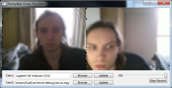 As I am doing dynamic pixel expansion, we began dropping frames which clearly meant we are eating too much time. To temporarily fix this I reduced the frame size back down to 320x240 (the lab cameras output at this resolution but the webcam I have been testing with outputs at 640x480). This stopped the dropped frames, however we WILL need to make the pixel expansion static from a list of translations to meet this weeks milestone. Additionally we will need to adjust the UI to fit the newly sized frames.
