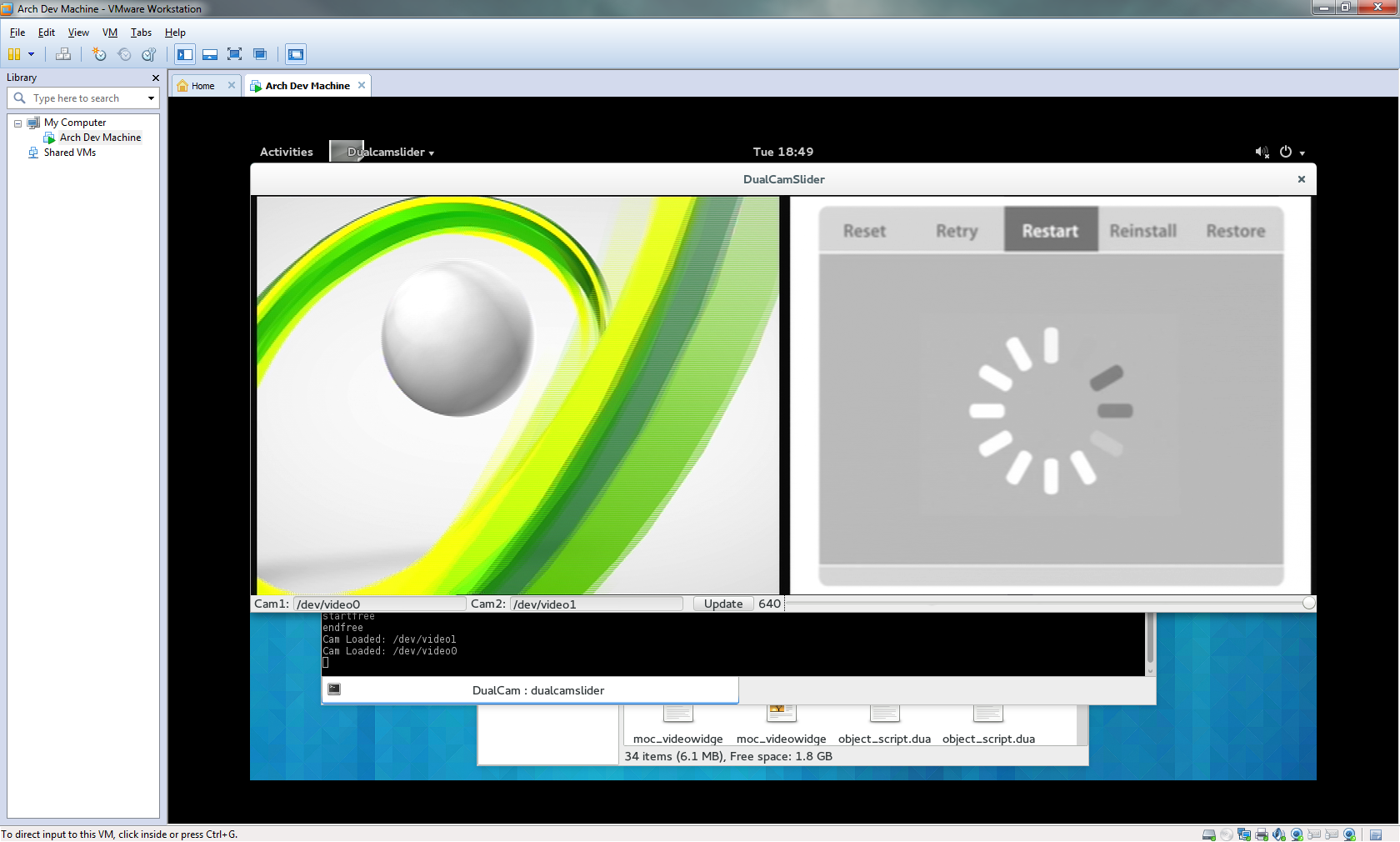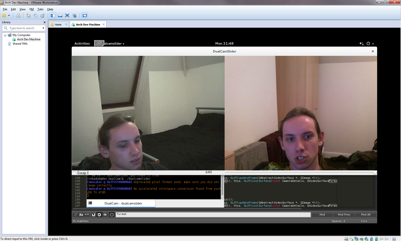 I then spent this evening 'porting' it to my Arch Linux vm, it was actually far easier than I would have expected. Most my trouble was caused by installing a text editor (I'm pretty new to AUR). Once 'ffmpeg' & 'qt4' were installed, I simply had to update the paths in the QT Project file, and adjust the driver/camera details in the code (In a later release I'll create seperate QT project files, that pass environment specific compiler directives to save making the changes everytime. From there it compiled second time (first time I got an issue about gdb missing, so I installed that quickly), and then ran (after I realised the command was './<mybinary>' rather than '. <mybinary>'.